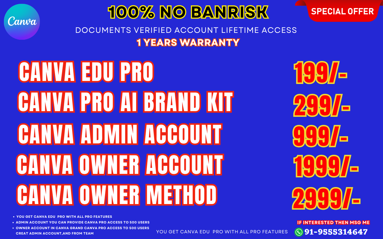 Get lifetime Canva Pro and Edu Pro accounts with admin access for up to 500 users. Digital Guru Agency provides verified accounts with all premium features, warranty, and no ban risk.Canva Pro Services